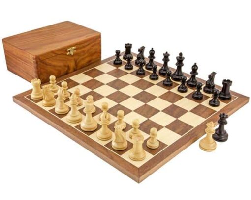 Ensemble Competition Echiquier en Bois de Noyer et d’Erable, Jeu d’Echecs en Bois de Buis & Coffret de Rangement en Bois de Rose Doré – Jeu d’Échecs Luxueux et Coffret de Rangement en Bois de Rose Doré